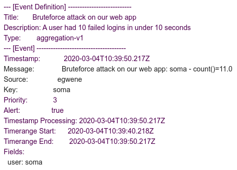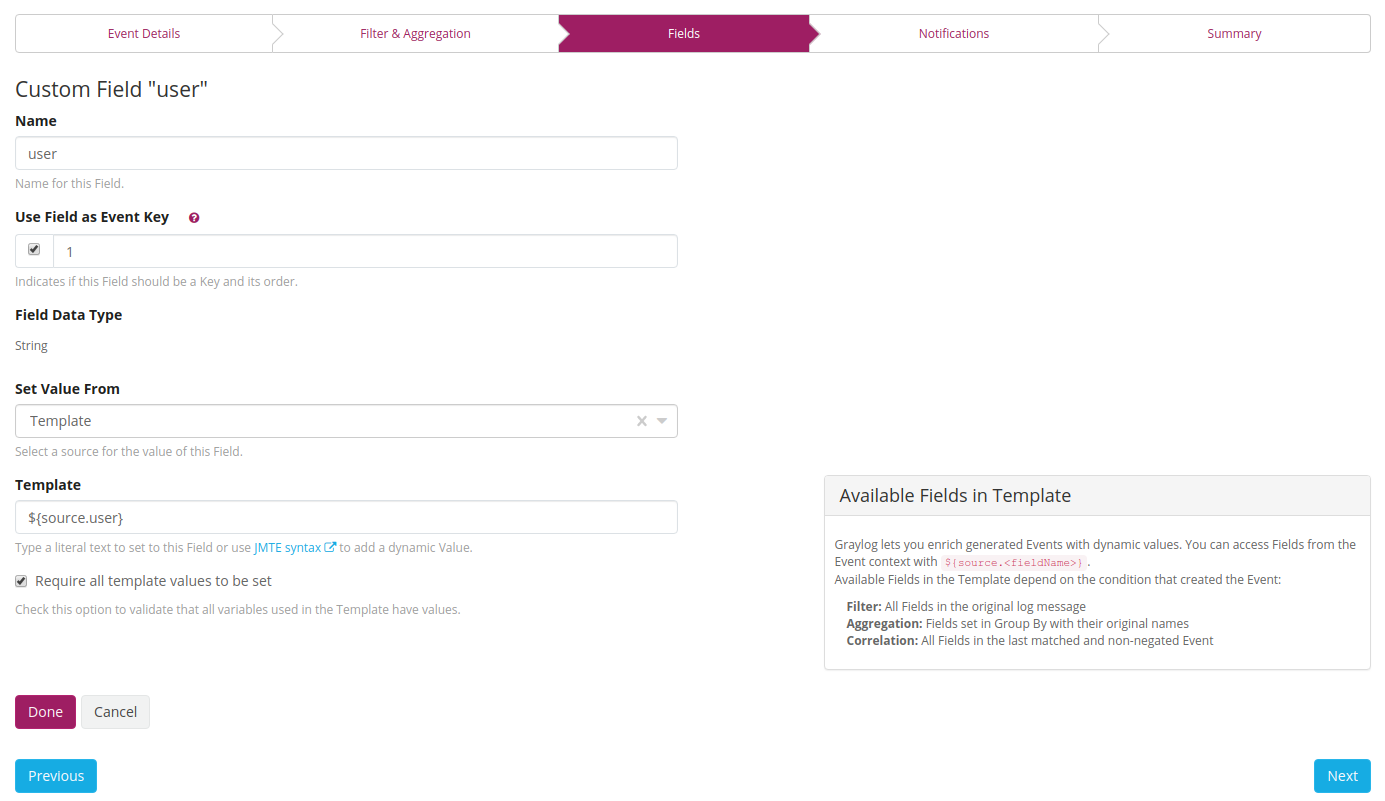 Since we are using an aggregation event definition, the only accessible fields are the ones we configured in the  Group by Field(s). When aggregating multiple messages to one event we lose all fields we do not make a group by on. We want to add the user key to our notification, which we put in our  Group by Field(s).