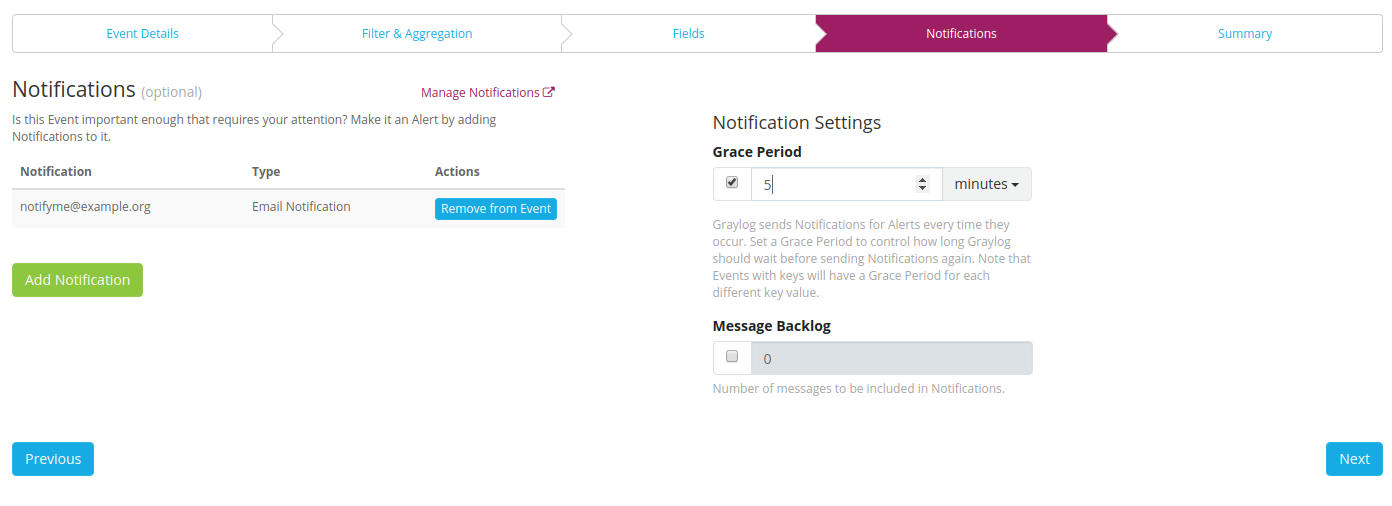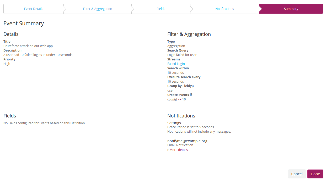 We want to receive an email when the event got raised. Configuring a notification, will elevate the event to an alert. How to setup an email notification is explained here. We will therefore select our already defined email notification and set our Grace Period to 5 Minutes. If we are target of a brute force attack then we do not want to get an email every 10 seconds reminding us that we are being attacked. This Grace Period will only be respected per Event Key we selected in our custom fields. So we will get an email for every new user name the attackers are using.